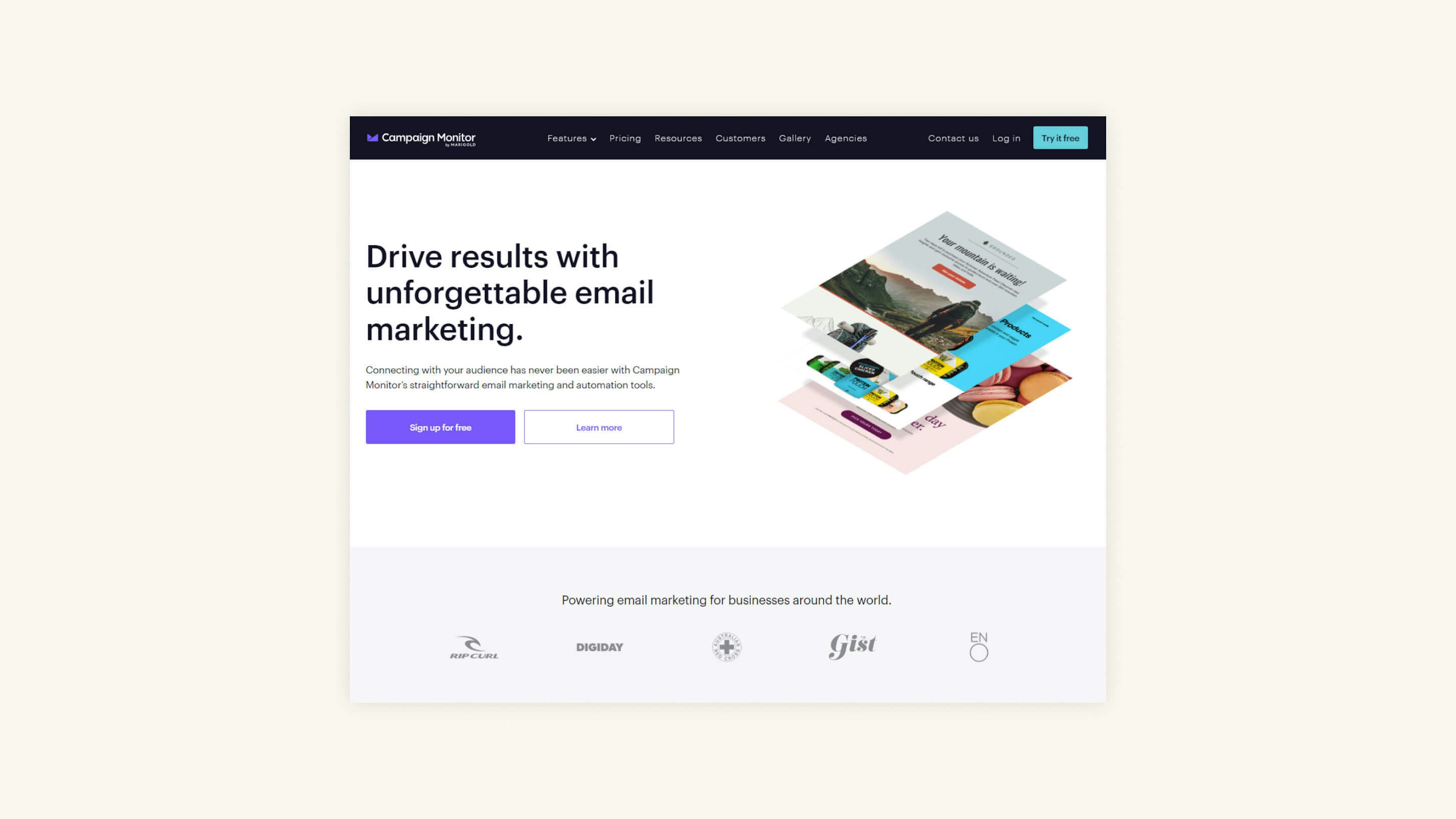 Campaign Monitor has been clever with their implementation of client logos. The placement is such that their presence is noticeable enough to remind users that well-known businesses use this service, but not so noticeable that they distract from the primary and secondary calls to action. They’ve also gone one step further and presented the client logos in a monotone format to ensure the presence of additional colours doesn't impact the dominance of the primary CTA.