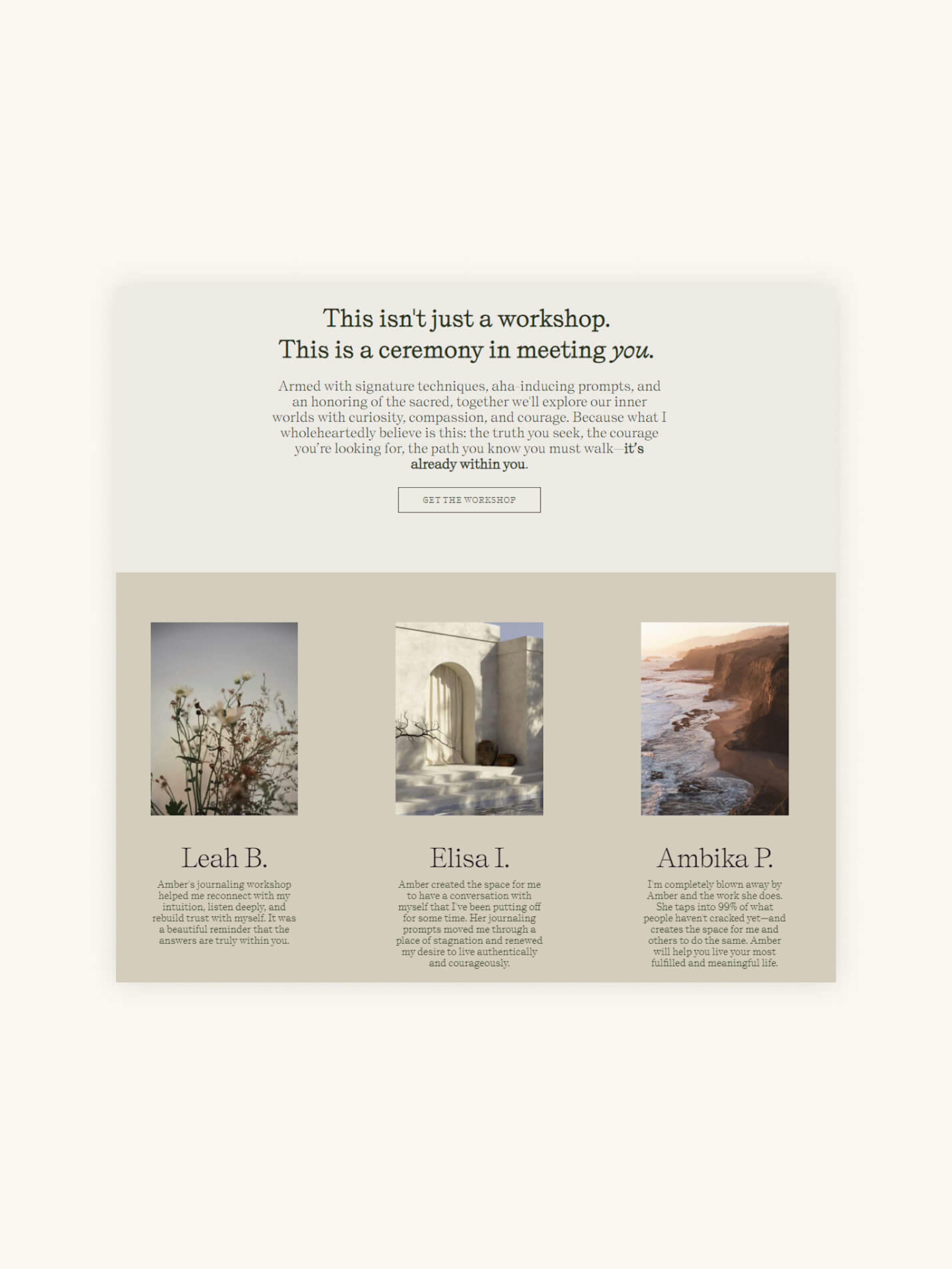 Testimonials can be helpful on your site in various contexts but come into their own when displayed close to important points of action in the customer journey. The following screenshot (on the left) taken from a journaling website is a good example of using testimonials to support the user's decision to join the workshop.