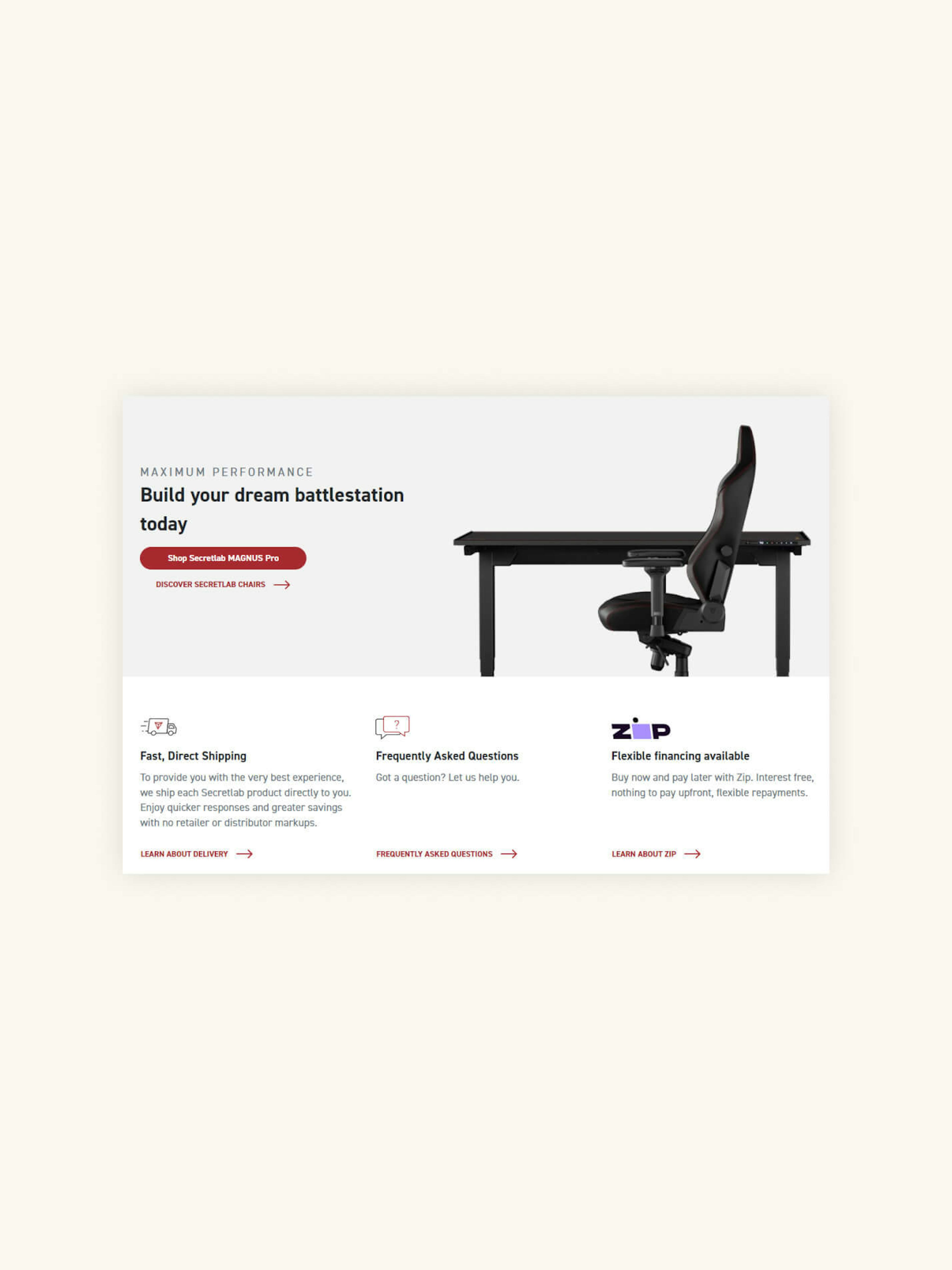 Free shipping, privacy and refund policies all fall under this categorisation. If your customers can benefit from your process or policies, let them know. For example, Furniture manufacturer Secretlab promotes their fast shipping and financing options close to purchase calls-to-action on their product pages.