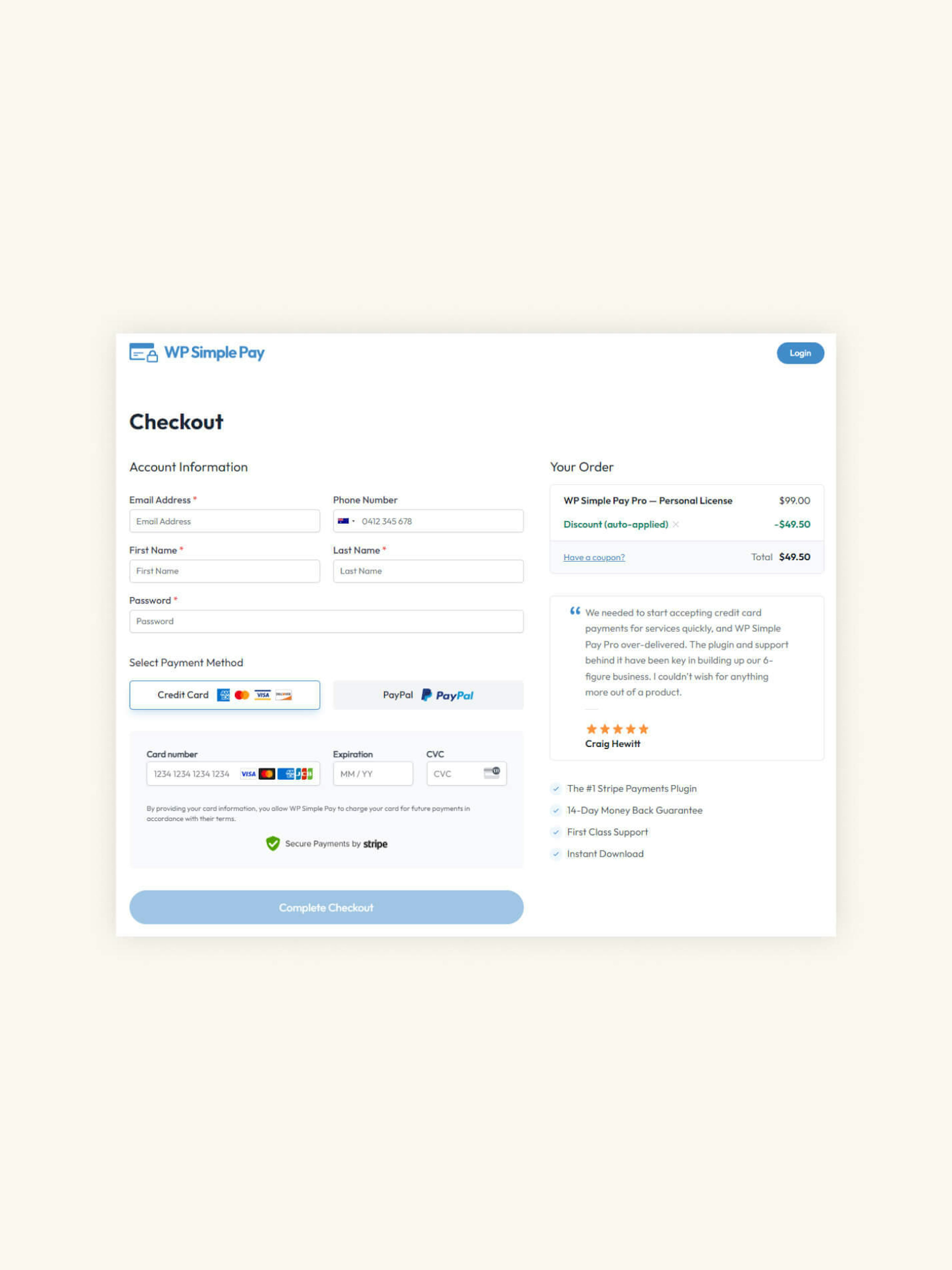 Implementing testimonials next to points of action for eCommerce sites can be more challenging. Given the space taken up by testimonial content, including this kind of social proof next to an add-to-cart button risks adding distracting noise to the purchase process. On the other hand, your checkout pages can be perfect for this kind of display, as shown in this example from WP Simple Pay (right).