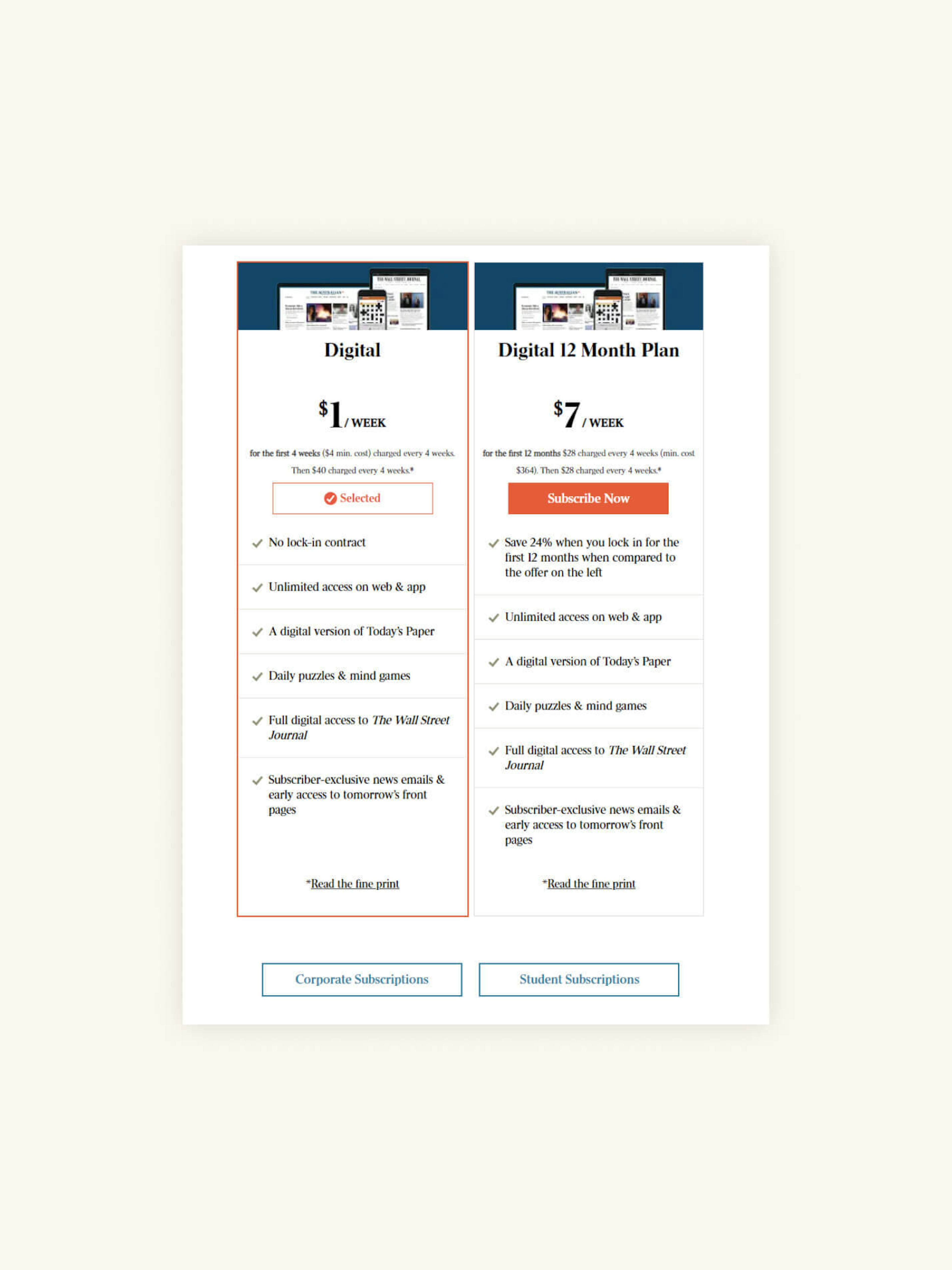 By comparison, The Australian newspaper (right) does a much poorer job of providing the clarity people demand when assessing trials. Yes, The Australian's offer is inherently less appealing since it requires (reduced) payment upfront, but it’s also not presented as clearly or appealingly as Blinkist's. The focus on customer control is almost entirely absent, and despite being written in a manner that suggests a cheaper trial period, the pricing for the 12-month plan is a fixed cost. Finally, we must reserve some criticism for the 'read the fine print' call to action. Members of the general public never use 'fine print' as a positive, so its use here is likely to cause more anxiety than less.