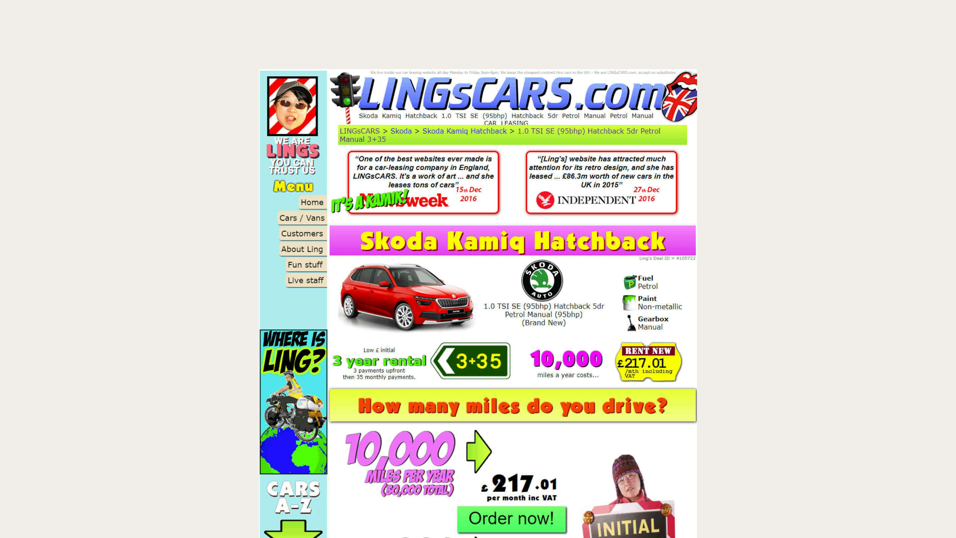 Ling's Car Rentals trades heavily on having one of the web's most intense site designs. While this geo-cities era design is all part of the joke, it remains an excellent example of what not to do with web design. The green "Order now" button in the shot above is the primary CTA, but the myriad of other high-contrast elements on the page prevent it from standing out.