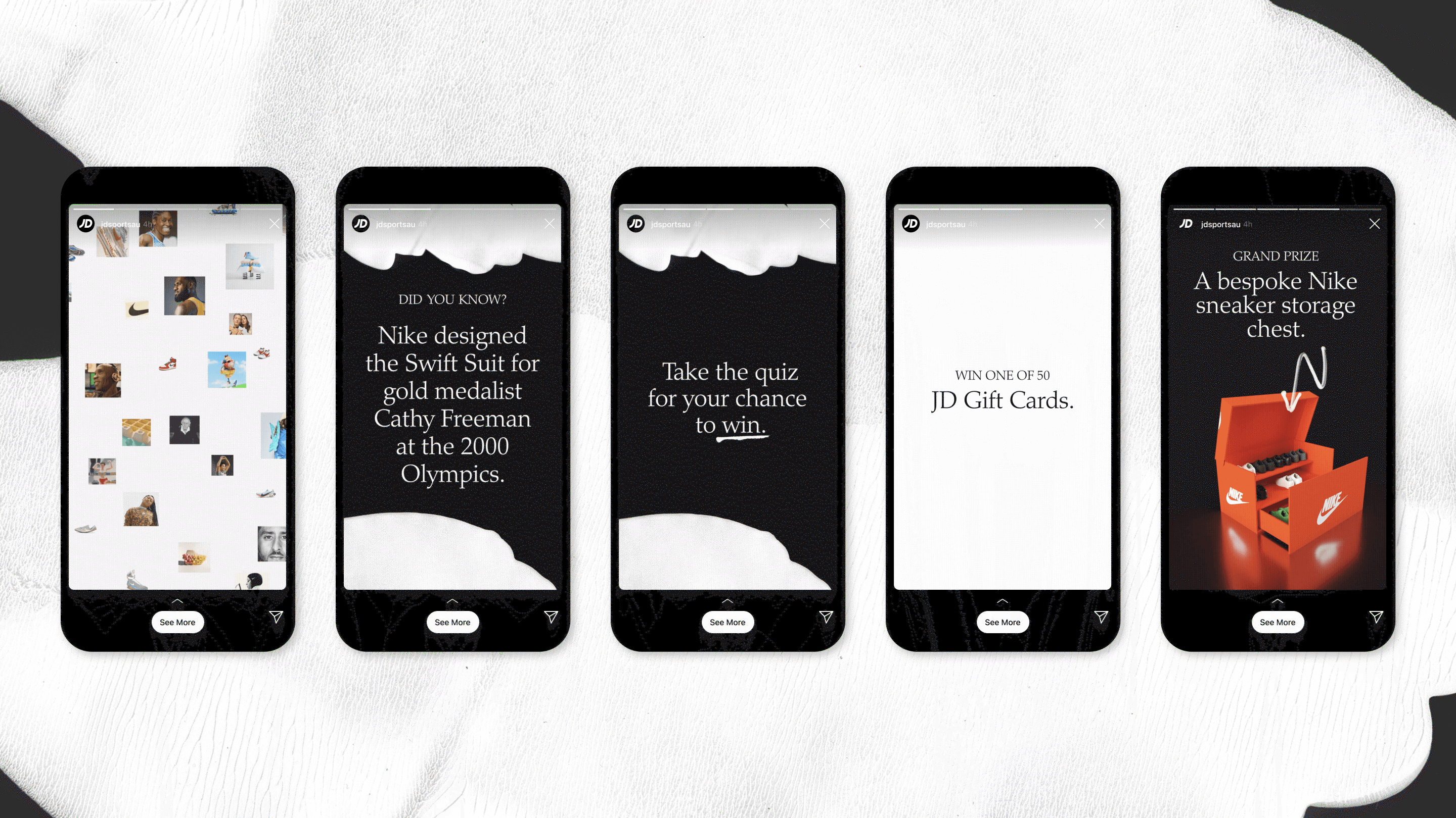 JD Sports engaged Tundra to help celebrate Nike’s 50th Anniversary and their partnership. The brief was to design and build a trivia quiz about the history of Nike, to live on the JD Sports website. Users would need to answer a series of multiple choice questions and an open-ended question at the end for their chance to win one of 50 $50 JD Sports gift cards. One lucky winner would also take home the major prize of a bespoke Nike shoe chest.