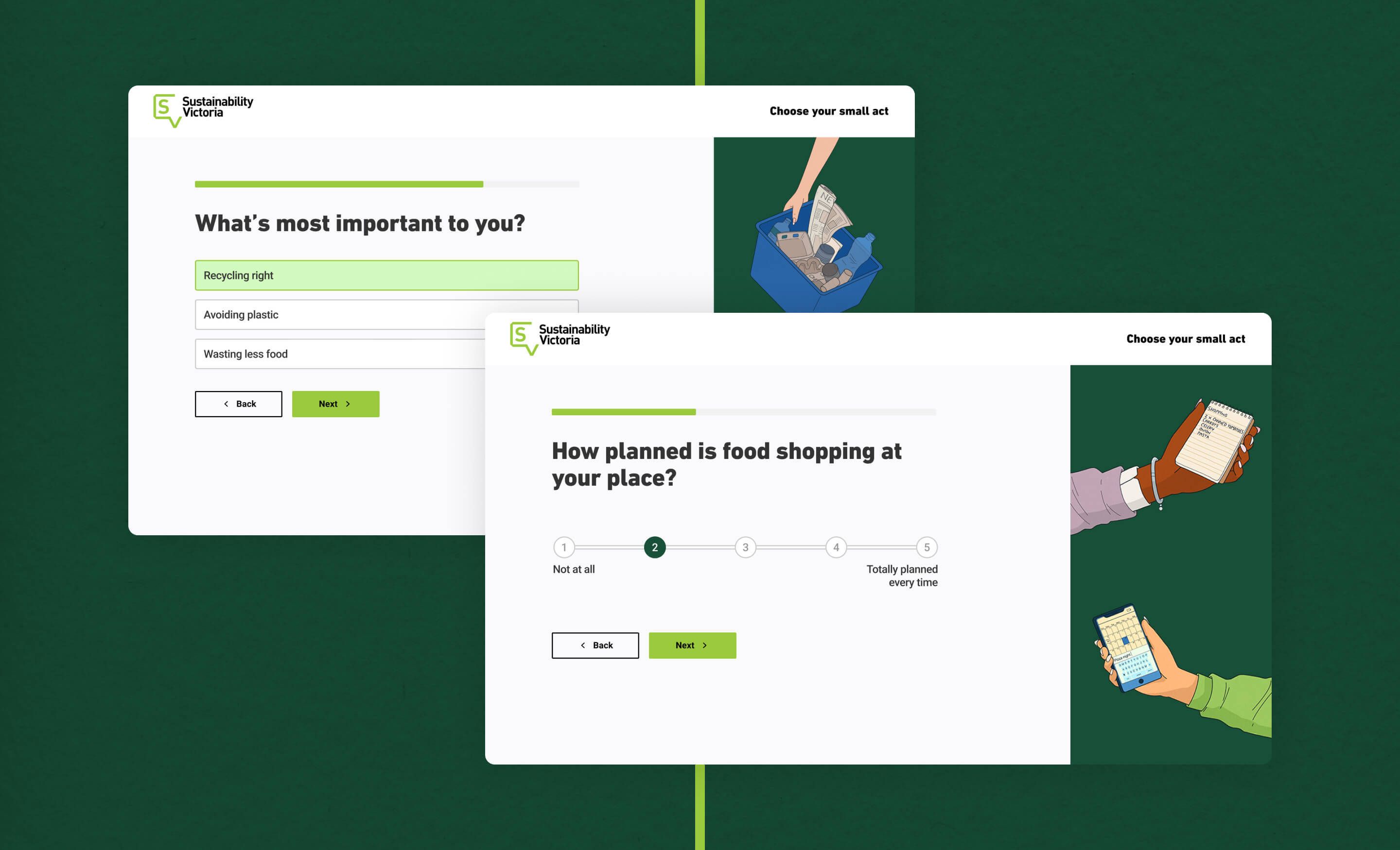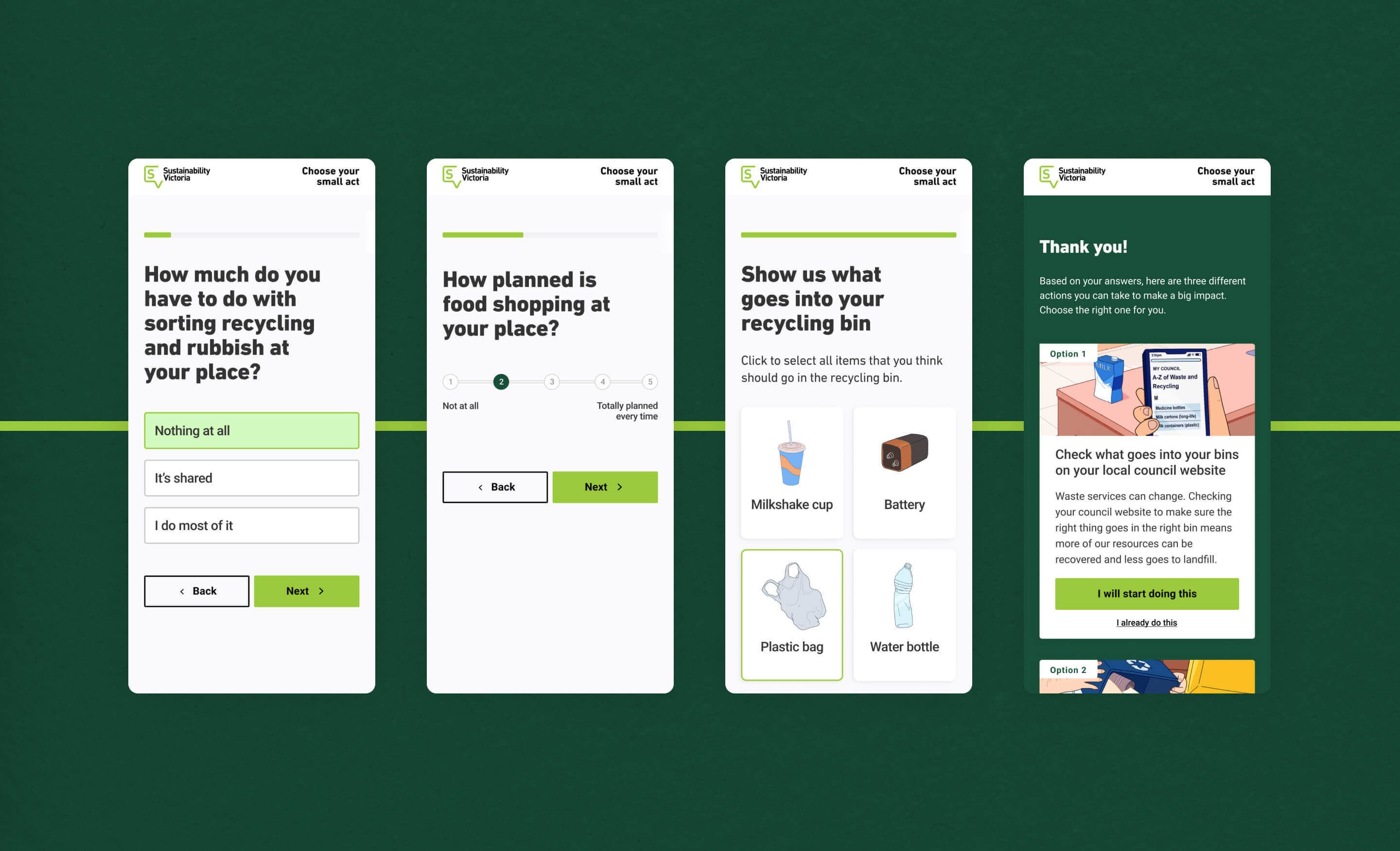 As this quiz would form part of a larger campaign, Sustainability Victoria had created a distinct series of brand assets that the tool needed to utilise. We worked to blend these assets with Sustainability Victoria’s existing digital brand guidelines to ensure a seamless experience for users visiting the Sustainability Victoria website.